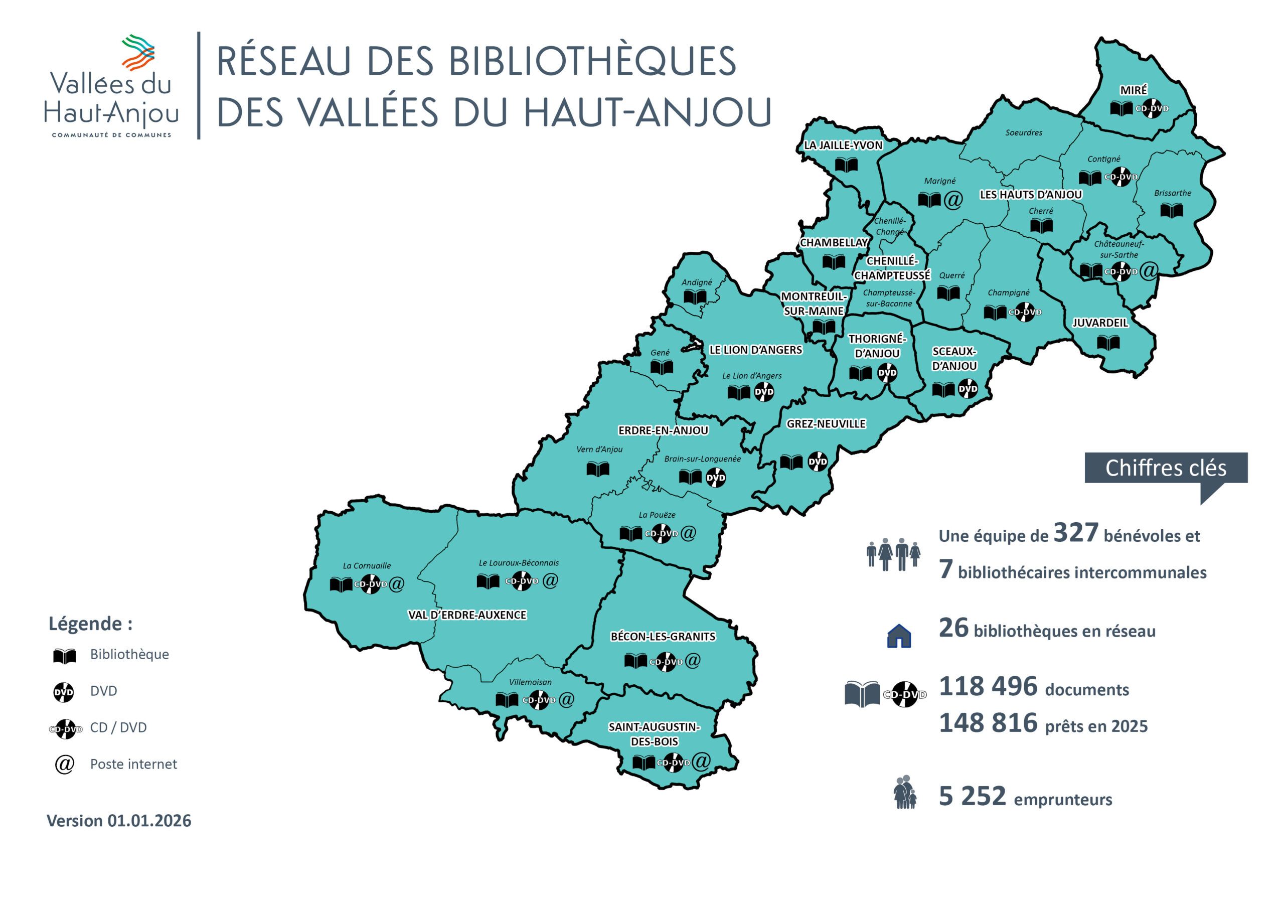 Le réseau des bibliothèques des Vallées du Haut-Anjou compte 26 bibliothèques réparties sur l’ensemble du territoire, environ 120 000 documents empruntables pour les petits et les grands et plus de 300 bénévoles à votre service. Depuis le 1er septembre, avec une seule carte gratuite, vous pouvez emprunter dans toutes les bibliothèques des Vallées du Haut-Anjou et bénéficier de nombreux services.